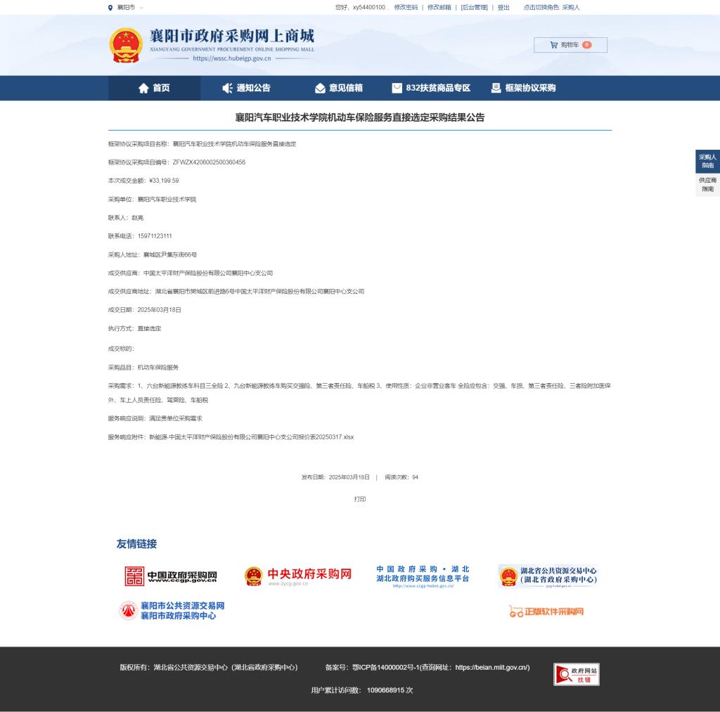 襄阳汽车职业技术学院机动车保险服务网上商城采购结果公告